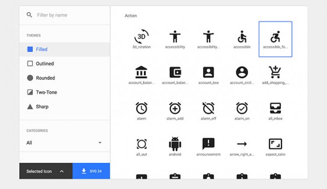 А если у вас есть возможность, реализуйте дополнительные инструменты/сервисы для упрощения работы с вашим набором. Так, иконками Material легко пользоваться благодаря специальной онлайн библиотеке. Она позволяет легко отыскать нужный вам объект, загружать разные темы оформления (стили), выбирать форматы, а также цвета и размеры материалов: