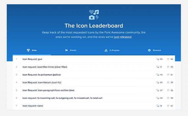 Создатели коллекции Font Awesome хоть и пренебрегли некоторыми принципами, однако сделали свои иконки максимально доступными для рядовых пользователей. Они предложили несколько методов работы: с помощью библиотеки, CDN, шрифта иконок и SVG. Еще один крутой инструмент здесь – публичное обсуждение, помогающее определить самые востребованные для внедрения объекты + информация о тех, что еще находятся в процессе разработки.