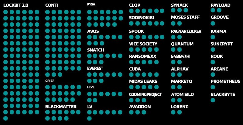 Среди шифровальщиков, атакующих промышленную инфраструктуру, наиболее активными оказались LockBit и Conti, на долю которых пришелся 51% инцидентов. В общей сложности эти группировки несут ответственность за 166 атак на компании в секторе ICS: LockBit — за 103 инцидента, а Conti — за 63.
