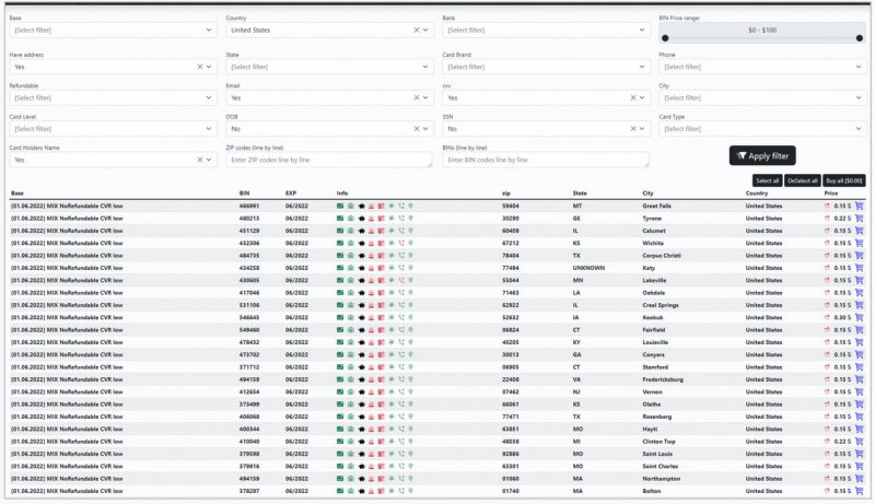 Также на BidenCash работает система фильтрации, позволяющая злоумышленникам находить украденные карты, подходящие именно для их кампаний. Можно искать по конкретным параметрам: странам, банкам или только записи, в которых есть необходимые данные, такие как CVV, адрес электронной почты, физический адрес, тип карты и имя владельца. Проведенный журналистами Bleeping Computer тест показал, что хакеры могут покупать данные о подходящих им картах всего по 15 центов за штуку.