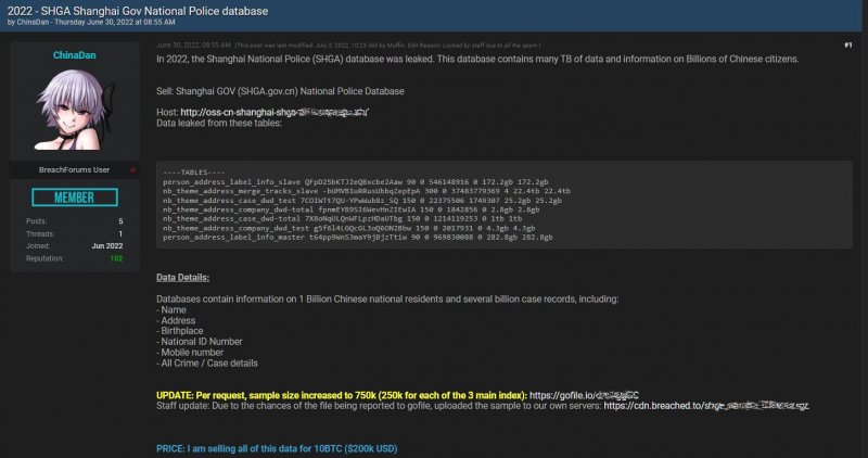 ChinaDan утверждает, что данные были похищены у Шанхайской национальной полиции (SHGA), и БД содержит имена, адреса, номера национальных удостоверений личности, контактные телефоны и информацию о нескольких миллиардах судимостей.