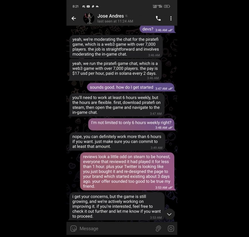 Как сообщил один из читателей PCMag, игру также пытались распространять через Telegram. По его словам, в Telegram-канале, где было много пользователей из США, разместили предложение о работе: вакансию модератора внутриигрового чата PirateFi с оплатой 17 долларов в час.