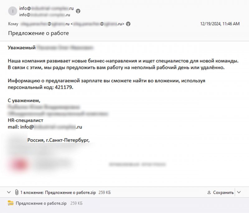 В конце 2024 года злоумышленники попытались проникнуть в одну из российских компаний. Предположив, что на компьютере одного из сотрудников может находиться ценная информация, группировка отправила жертве фишинговое письмо с предложением рассмотреть вакансию в реальной промышленной организации.