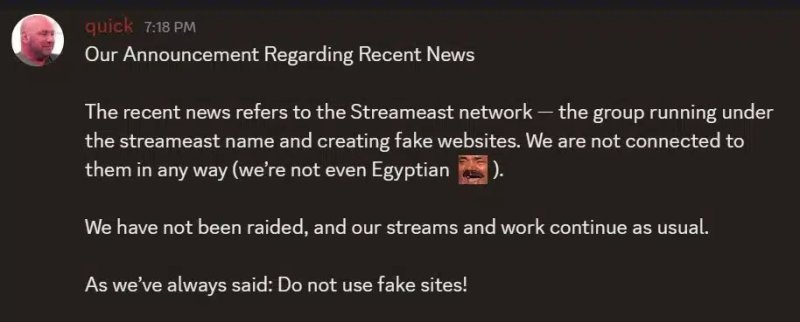 Восемьдесят доменов, ранее принадлежавших Streameast, теперь перенаправляют посетителей на сайт ACE «Watch Legally», который содержит ссылки на легальные платформы.