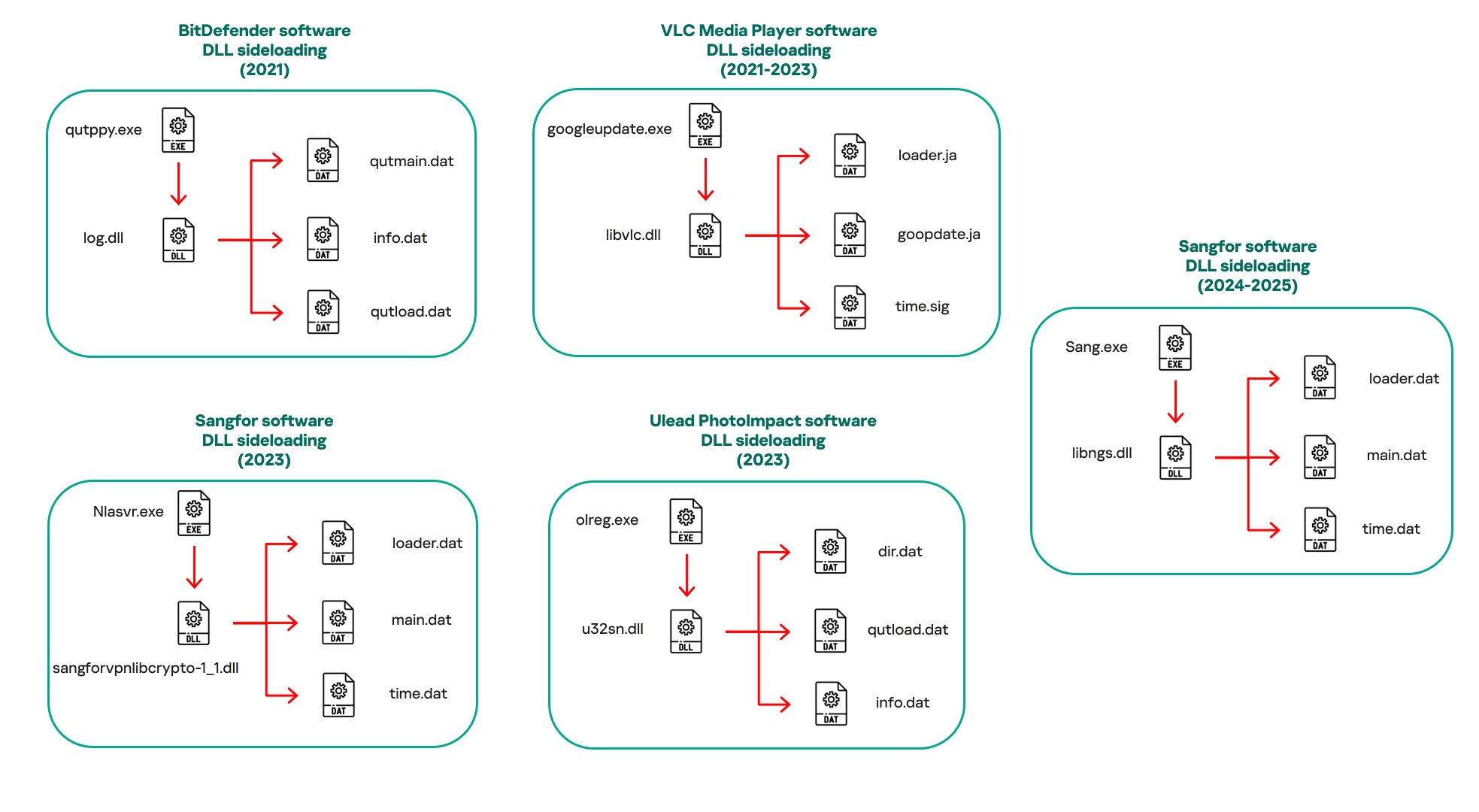 Для запуска вредонос использует технику DLL sideloading: загружает вредоносную библиотеку через подписанные легитимные приложения. В период с 2021 по 2025 год злоумышленники применяли для этого продукты Bitdefender, VLC Media Player и несколько решений компании Sangfor.