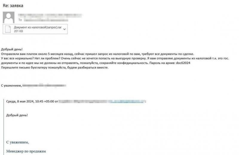 Чтобы вызвать доверие получателя, злоумышленники замаскировали свое сообщение под ответ на некое ранее отправленное письмо, а в тексте намекнули на срочность (якобы идет налоговая проверка) и попросили поскорее переслать информацию бухгалтеру.