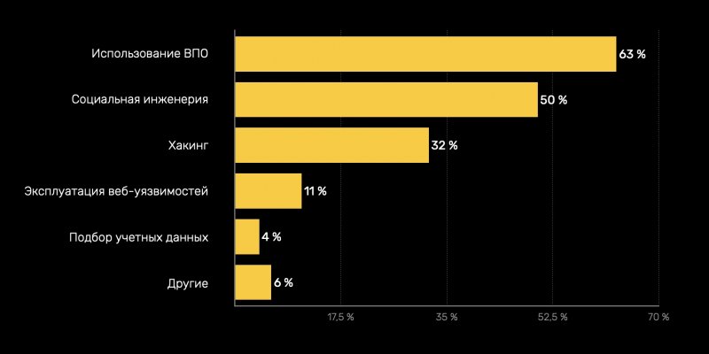 - Чаще всего хакеры использовали малварь (63%), социальную инженерию (50%), а также эксплуатировали недостатки защиты и уязвимости в софте (32%).