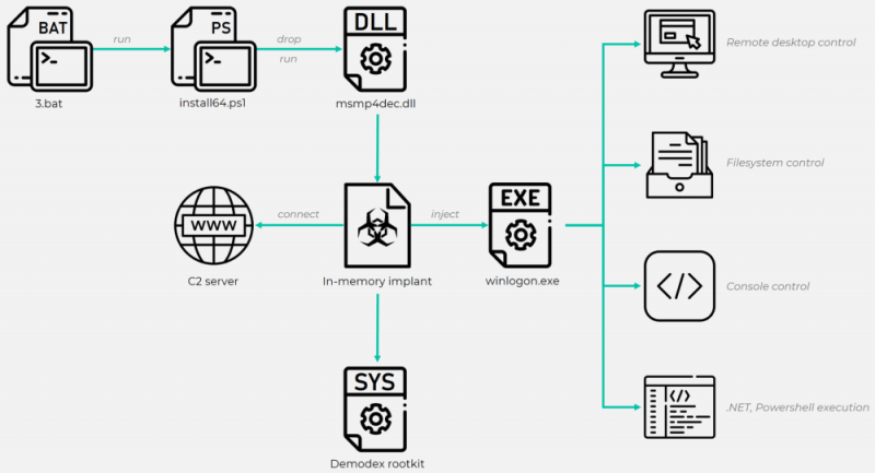 Также известно, что хакеры используют набор различных скриптов и инструментов для развертывания бэкдоров в сетях жертв. Затем такой бэкдор применяется для загрузки и запуска инструмента Cheat Engine, часто используемого геймерами для внедрения читов. Однако хакеры применяли мощные драйверы Cheat Engine для обхода защитных функций Windows PatchGuard и установки руткита Demodex в ОС жертвы. Этот руткит специалисты называют очень продвинутым, так как он позволяет хакерам сохранить доступ к устройству жертвы даже после переустановки ОС и даже в системах с последними версиями Windows 10.