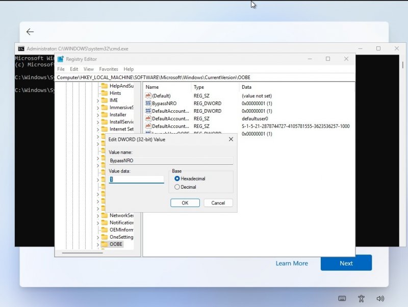 Также можно вручную создать BypassNRO с помощью Regedit, запустив его из командной строки через Shift+F10.
