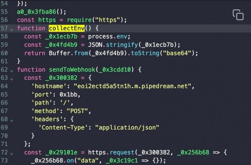 По данным исследователей, этот jаvascript похищает переменные окружения и конфиденциальные данные (ключи API, токены доступа, ключи SSH) с зараженных устройств и отправляет их на удаленный сервер eoi2ectd5a5tn1h.m.pipedream[.]net.
