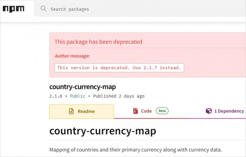 Сопровождающий country-currency-map отозвал вредоносную версию (2.1.8) и опубликовал заметку, в которой посоветовал разработчикам использовать безопасную версию 2.1.7.