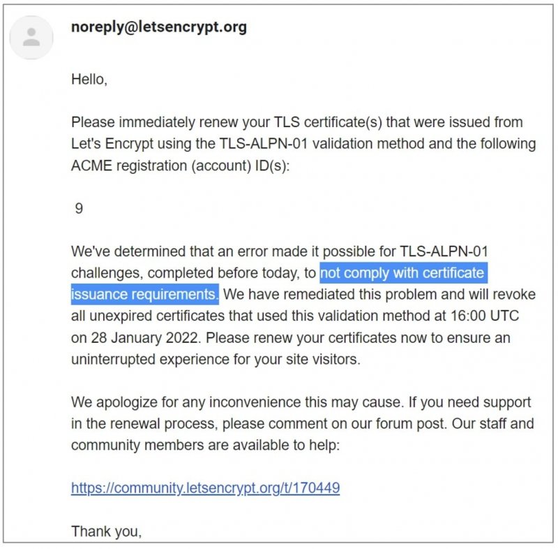 В эту пятницу (28 января 2022 года) некоммерческая организация Let’s Encrypt планирует отозвать около двух миллионов SSL/TLS-сертификатов, поскольку они были выпущены некорректно.