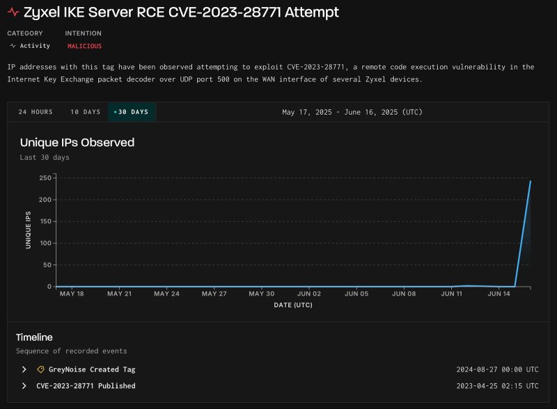 Ранее уже сообщалось, что CVE-2023-28771 активно используют Mirai-ботнеты, но по данным GreyNoise, с 16 июня 2025 года атаки на эту проблему заметно усилились.