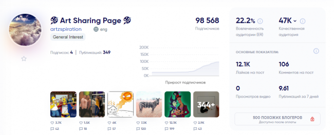 Аккаунт посвящен творчеству, искусству и креативу. На площадку подписано 98 568 пользователей. Количество фолловеров быстро растет. Это прекрасно прослеживается. На момент начала торгов количество подписчиков аккаунта насчитывало 77 265 фолловеров, а при анализе профиля уже 98 568.