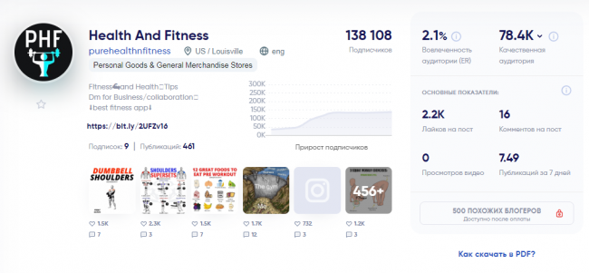 Площадка на тему здоровья, фитнеса, питания и бодибилдинга. На аккаунт подписано 138 108 фолловеров. Цена продажи неизвестна, так как лот был быстро удален с маркетплейса. По данным trendHERO, на площадке 138 108 человек качественной аудитории. Это реальные и коммерческие аккаунты, а также инфлюенсеры. Коэффициент вовлеченности удовлетворительный 2,1%. В среднем в неделю выходит 7 постов, каждый из которых получает по 2 206 лайков и 16 комментариев.