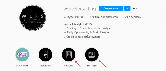 В stories есть ссылки на магазин и курсы по обучению серфингу. По словам владельца, это приносит $400.