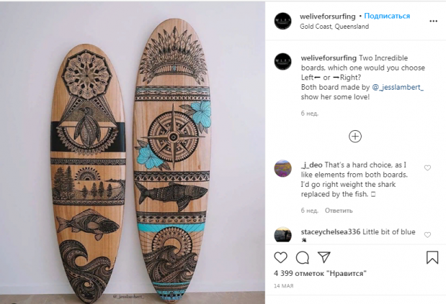 Аккаунт посвященный серфингу и всему, что с ним связано. На площадку подписано 129 017 человек.