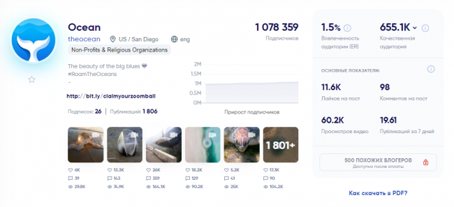 Площадка в широкой тематике, посвященная мировому океану. На аккаунт подписано 1 078 359 фолловеров.