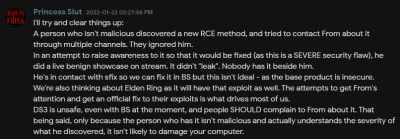 Судя по всему, стример не просто стал жертвой случайного тролля. Согласно скриншоту из Discord SpeedSouls, взломщик обнаружил уязвимость некоторое время назад и пытался связаться по этому поводу с разработчиками из FromSoftware, однако его проигнорировали, поэтому он начал взламывать стримеров, пытаясь привлечь внимание к проблеме.