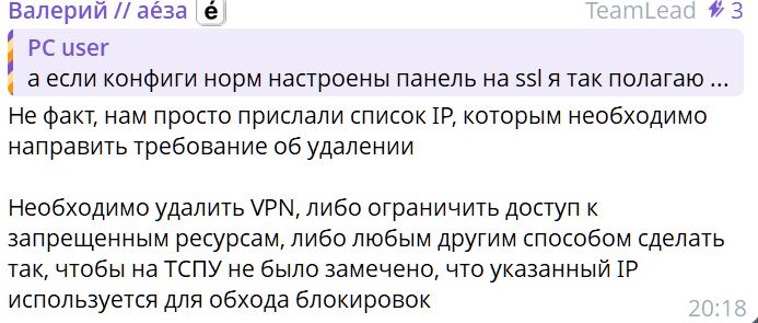 Как сообщают в Telegram сотрудники хостера, Роскомнадзор передал компании список IP-адресов, по которым необходимо направить требования об удалении средств для обхода блокировок.