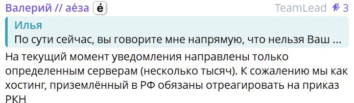 «Получив уведомление от РКН, мы, как хостинг-провайдер, юридически обязаны принять меры», — говорят представители компании.