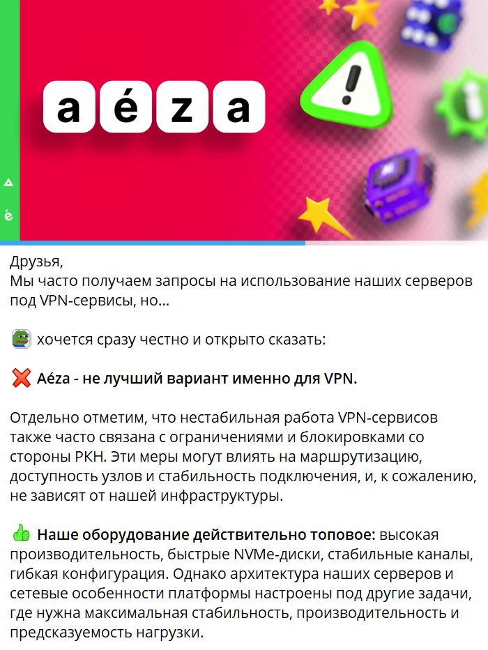«Aéza - не лучший вариант именно для VPN. Отдельно отметим, что нестабильная работа VPN-сервисов также часто связана с ограничениями и блокировками со стороны РКН. Эти меры могут влиять на маршрутизацию, доступность узлов и стабильность подключения, и, к сожалению, не зависят от нашей инфраструктуры», — писали тогда в Aeza.