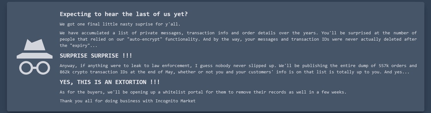 Судя по всему, до своего ареста Лин узнал о происходящем, так как в марте 2024 года он внезапно закрыл Incognito и отказался возвращать средства пользователям, вместо этого угрожая опубликовать историю всех сделок, если те не заплатят выкуп.