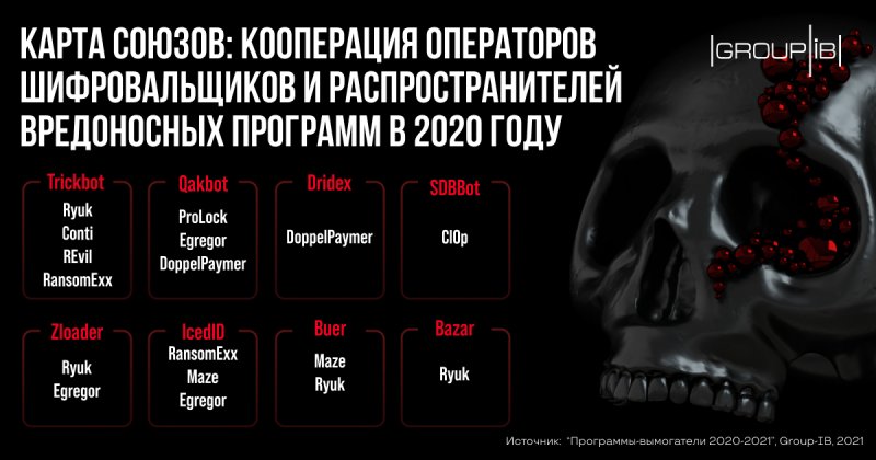 Еще одна тенденция 2020 года — коллаборации между разными преступными группами. Эксперты зафиксировали в прошлом году появление в андеграунде 15 новых публичных партнерских программ-вымогателей. Действующие преступные группы, использующие вредоносные программы Trickbot, Qakbot и Dridex, все чаще помогали операторам малвари получать первоначальный доступ к корпоративным сетям.