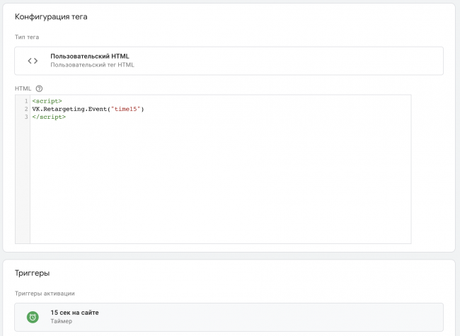 Перейдем к подключению событий. В первую очередь добавим событие, которое будет срабатывать после того, как посетитель проведет на сайте больше 15 секунд. Это поможет исключить из будущих ретаргетинговых кампаний пользователей, которые быстро покинули сайт и не совершили целевого действия. Исключая такой сегмент из рекламных кампаний, вы не только сохраняете бюджет, но и не раздражаете пользователей, которые уже были на вашем сайте и не нашли ничего для себя интересного.