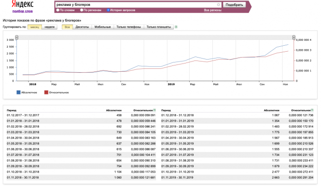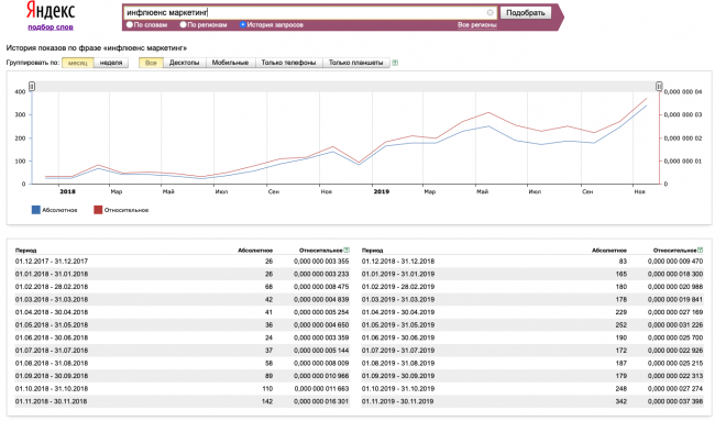К тому же если мы проследим динамику запросов в поисковых системах, то увидим, что число запросов «инфлюенс-маркетинг», «реклама у блогеров» и пр. увеличились за последние годы на 1000–1500%, и это невероятный рост.