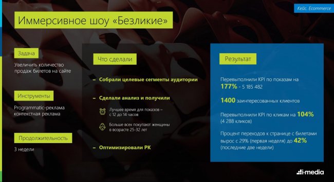 Давайте посмотрим, как programmatic работает в реальной жизни — в качестве элемента performance-стратегии. В 2018 году наше агентство вместе с коллегами из programmatic-платформы Omniscienta провело рекламную кампанию иммерсивного шоу «Безликие»: театрального спектакля нового формата, максимально вовлекающего зрителей в происходящее. Целью было увеличить продажи билетов через сайт шоу.