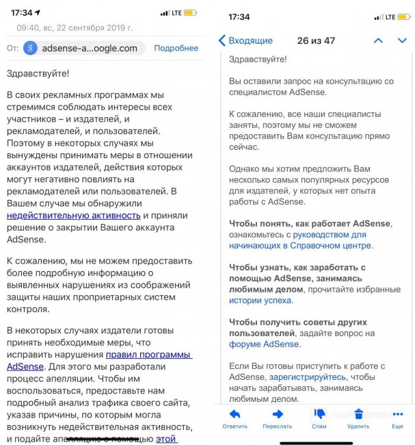 Но в один из дней по возвращению с турне, 22 сентября 2019 года мне приходит «письмо счастья», что мой аккаунт заблокирован за нежелательные клики. На аккаунте была приличная для меня сумма — 400 000 рублей. Я тут же написал аппеляцию, ответ на которую я получил спустя 2 месяца. В нем утверждалось, что разблокировать аккаунт не удастся.