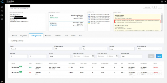 На каждого клиента Milton Group заводилось дело со статусом и ключевыми моментами. Так, William Bradley (сотрудник компании, к нему еще вернемся) пишет об одном из клиентов: «Ему нравится говорить о деньгах так, как будто они его не интересуют. Так или иначе, ему п#зда».