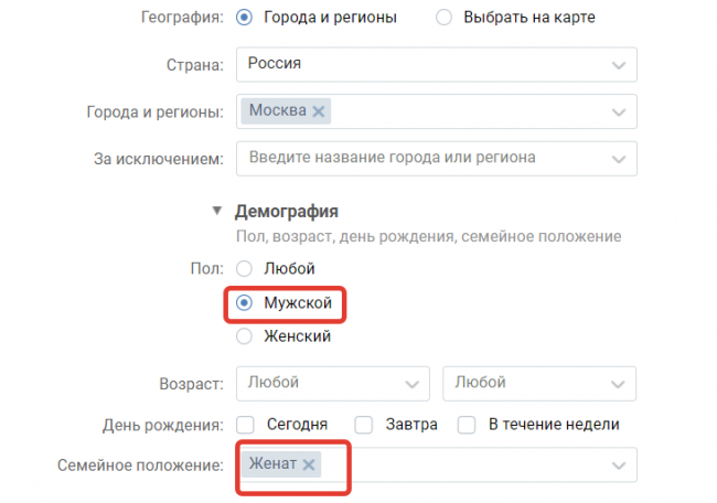 Или используем различные варианты статусов, например, во «ВКонтакте» можно выбирать пользователей с «Есть друг/подруга». А в Facebook — «В браке», «В отношениях» и т. д.