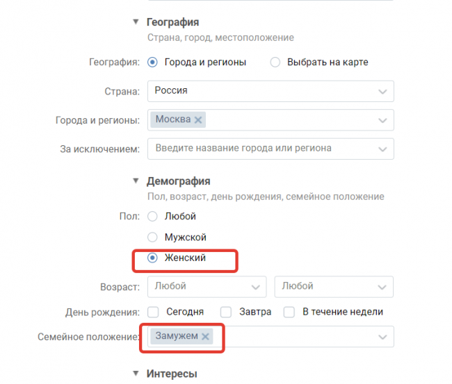 При горячем спросе можно использовать и настройку на широкую аудиторию. Например, выбираем женщин или мужчин и сегментируем по городу. Важно, чтобы в объявлении был четкий посыл вроде «Подарок на 8 Марта в Самаре» — по формуле «Что, когда и где».
