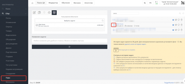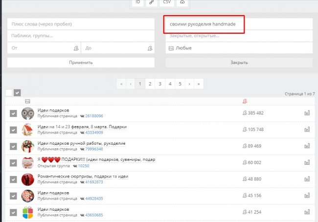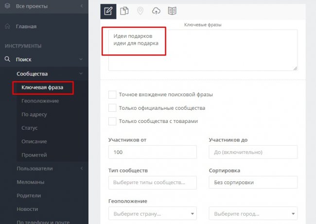 Заходим в сервис парсинга и собираем группы по ключевым словам.