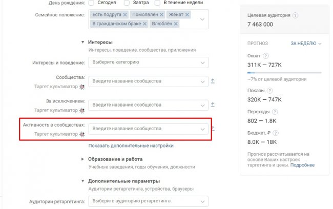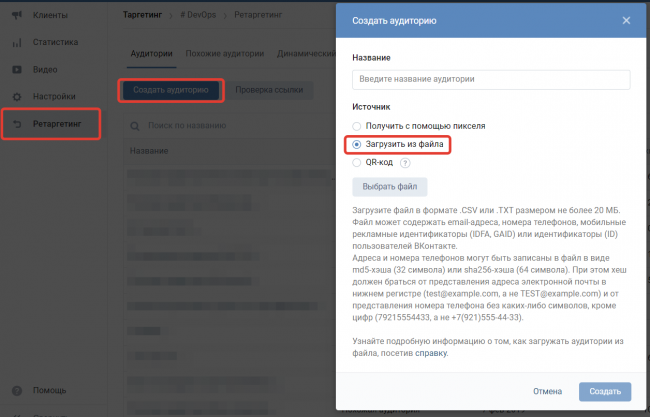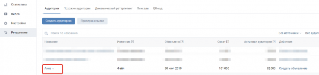 В рекламном кабинете «ВКонтакте» в раздел ретаргетинг загружаем собранную базу.