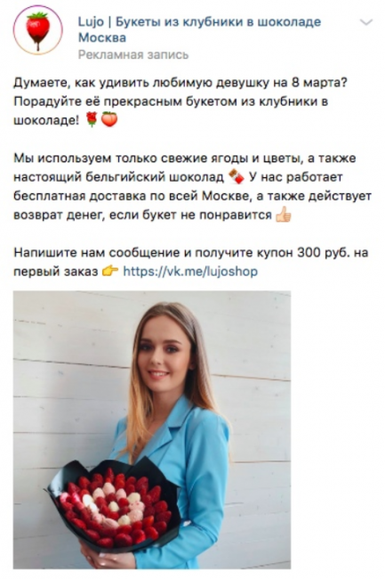 Например, для продвижения букетов из клубники мы использовали в объявлениях живые фотографии с улыбающимися клиентками. А поскольку таргетинг был на мужчин в отношениях, в тексте писали про любимую девушку и обязательно упоминали сам праздник.