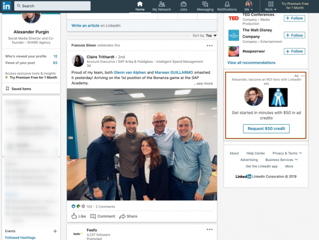 Социальная сеть LinkedIn заблокирована в России, но во всем мире в бизнес-среде активно используется как канал для продвижения. В ней зарегистрировано больше 660 млн пользователей и представлено более 30 млн компаний. Неплохие возможности для таргетинга. LinkedIn пользуются по всему миру. Почти. Особенность этой соцсети — в том, что люди заполняют профили как резюме. Они указывают места работы, учебы, должности, профессиональные навыки и даже могут подтверждать их внутри LinkedIn. Все эти данные, конечно, доступны рекламодателям. Рекламные возможности LinkedIn, очевидно, не самая популярная рекламная площадка в России. И, вероятно, не многие PPC-специалисты работали с ней, однако в ее рекламном кабинете нет ничего сложного. Чтобы убедить вас, кратко расскажу о том, с чем вы наверняка сталкивались в других каналах, и подробнее о возможностях, которые есть только здесь. Цели Как и в Facebook, создание кампании начинается с выбора цели. В соответствии с ней соцсеть будет показывать объявления тем, кто с большей вероятностью выполнит желаемое действие. Из необычного в целях — возможность находить кандидатов на вакансии (Job applicants). Аудиторные таргетинги Здесь можно создавать и использовать «Сохраненные аудитории». Сначала нужно выбрать географию и язык. Затем откроется доступ к параметрам аудитории, куда входят таргетинги по: полу; возрасту; образованию: ученой степени, специальности, учебным заведениям; компании: отрасли, размеру, названию, подписчикам страницы (если вы ее администратор), company connections (отдельно написал про это ниже); опыту: должностные обязанности, позиции (пожалуй, самый полезный таргетинг), специальности, навыкам, сроку работы; интересам: состоит в определенных группах внутри соцсети, указал определенные интересы. Как видите, таргетинги довольно стандартные, исключение составляет только company connections. Он поможет охватить друзей людей, работающих в нужной вам организации. С прошлого года LinkedIn позволяет пересекать таргетинги и, таким образом, получать еще более узкую аудиторию. Например, вы можете выбрать только директоров по маркетингу в возрасте от 35 до 54 лет, которые состоят в группах по AR. Также здесь можно использовать списки ремаркетинга или look-alike аудитории. Форматы рекламных объявлений На выбор предоставляют разные варианты в зависимости от цели компании. Я собрал все вместе. Есть обычные форматы и пара интересных фишек: пост в новостной ленте; карусель; пост с видео; текстовая реклама — аналог тизеров «ВКонтакте», показывается справа от ленты; Spotlight ad — персонализированный тизер с предложением; Follower ad — похож на Spotlight, но с призывом подписаться на сообщество; Message ad (ранее Inmail) — сообщение от представителя компании в личку, процент открываемости таких писем доходит до 70%. Справа Spotlight ad с предложением научиться рекламе в LinkedIn Есть возможность подключить Linkedin Audience Network — партнерские плейменты: приложения и сайты. По заверению соцсети, они увеличивают охват на 25%. Бюджет и график Здесь настройки довольно стандартные. Можно ограничить расходы в день, а можно одновременно и в день, и на весь срок кампании. Варианты оптимизации ставок зависят от формата объявления. Так, можно оставить управление ценой клика на усмотрение сети (Automated bid), установить ставку, которую система сможет менять, чтобы привести больше конверсий, или назначать вручную 