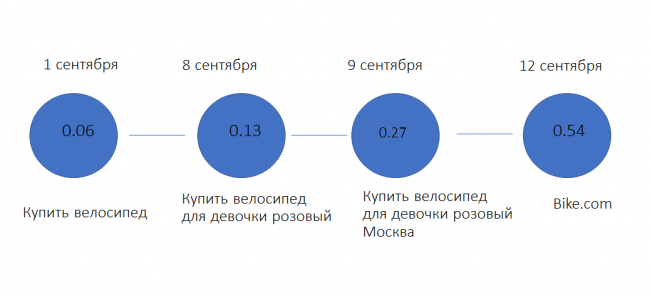 - Ну и наконец, 12 сентября он, побывав уже три раза на вашем сайте, вводит брендовый запрос bike.com и совершает покупку на вашем сайте.