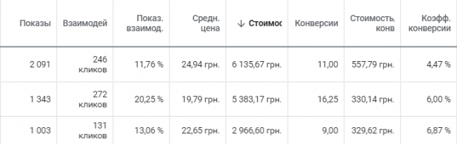 На скриншоте ниже три кампании с разным количеством коэффициентом и числом конверсий.