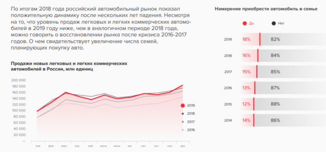 данным myTarget, в 2019 году 18% семей планировали приобрести авто, а в 2018 и 2017 — 16 и 15% соответственно.