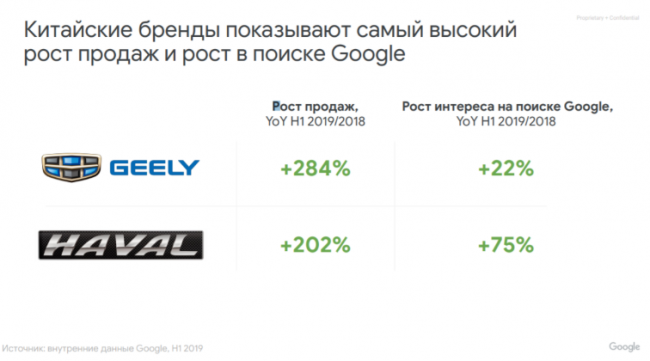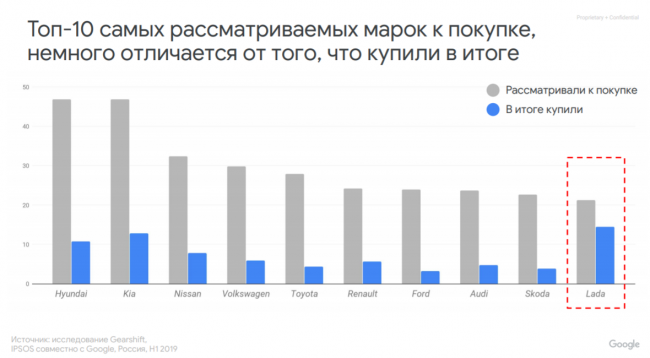 Google среди самых рассматриваемых к покупке марок выделяет Hyundai, Kia и Nissan. Любопытно, что в итоге чаще всего покупают машину марки Lada, хотя в рейтинге рассматриваемости она на последнем десятом месте.