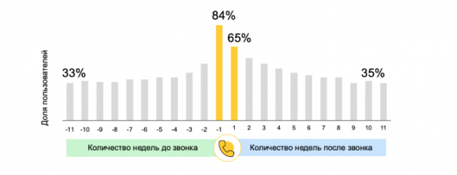 Больше всего поисковых запросов приходится на неделю до обращения в отдел продаж и неделю после него.