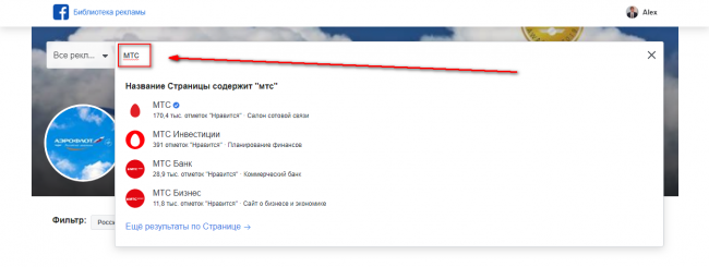 В этой поиска вводим название страницы конкурентов на Facebook.