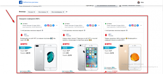 Теперь мы можем видеть рекламные посты этой страницы, а также привязанного к ней аккаунта в Instagram.