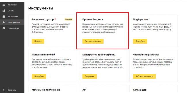 Яндекс.Директ и переходим в «Прогноз бюджета».