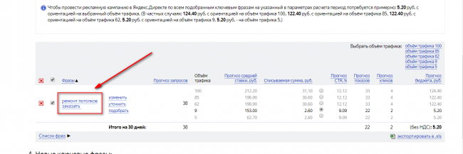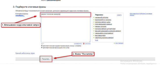Вводим ключевые слова, по которым могут показываться наши конкуренты. Можете брать как информационные запросы (например, «ремонт потолков»), так и конверсионные (например, «ремонт потолков заказать»):