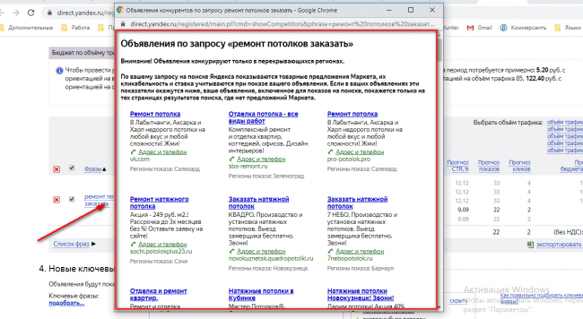 Откроется окно с объявлениями, которые показываются по этой ключевой фразе («ремонт потолков заказать»). При нажатии на любое объявление открывается сайт конкурента.